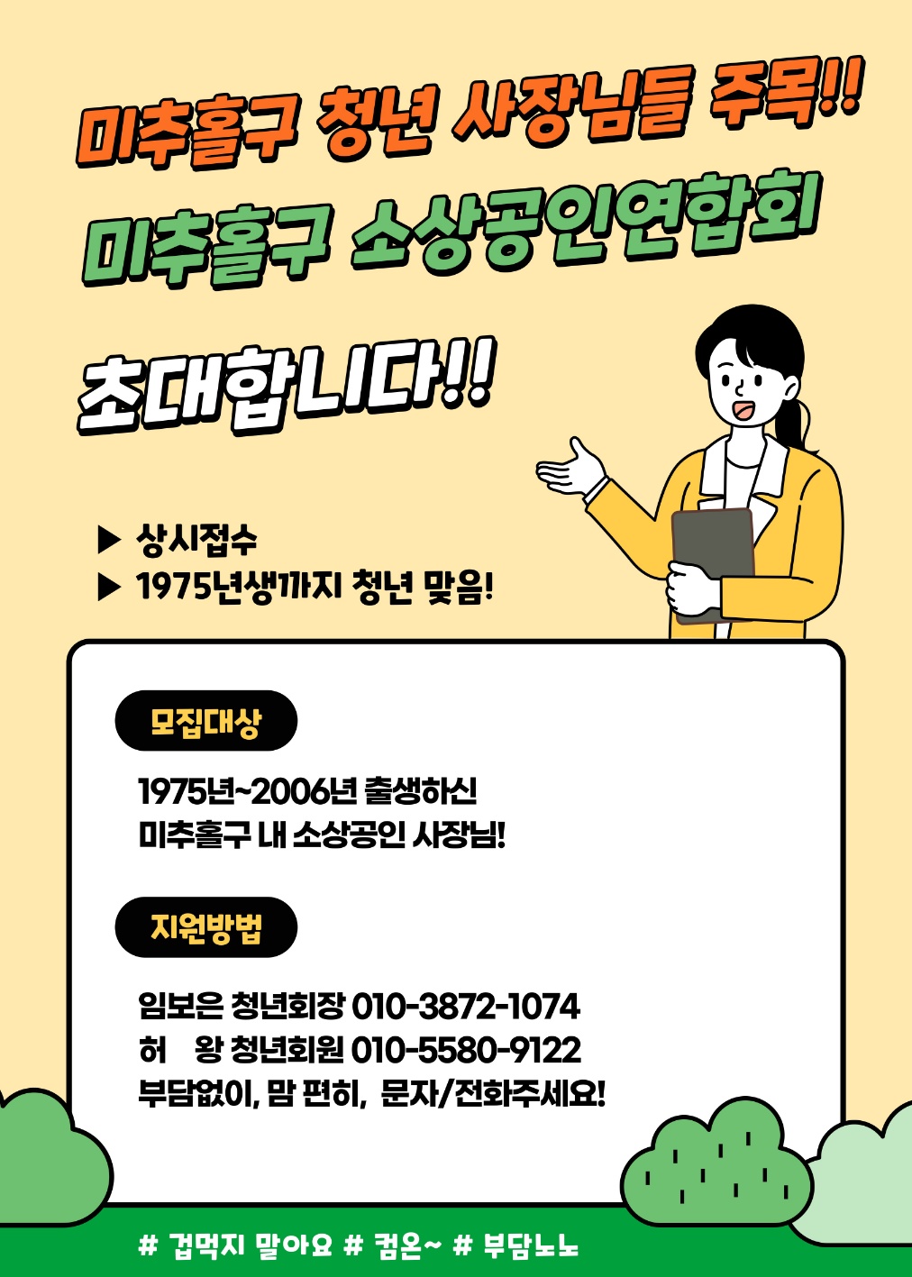 | 미추홀구소상공인연합회 신규 회원 모집 안내 (0) | 2026.01.09 |