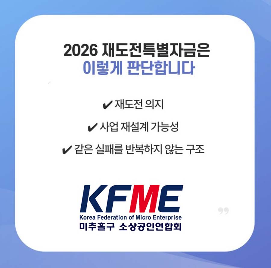 | 2026년도 소상공인 희망클린 지원사업 – 미추홀구 소상공인연합회 (0) | 2026.02.03 |