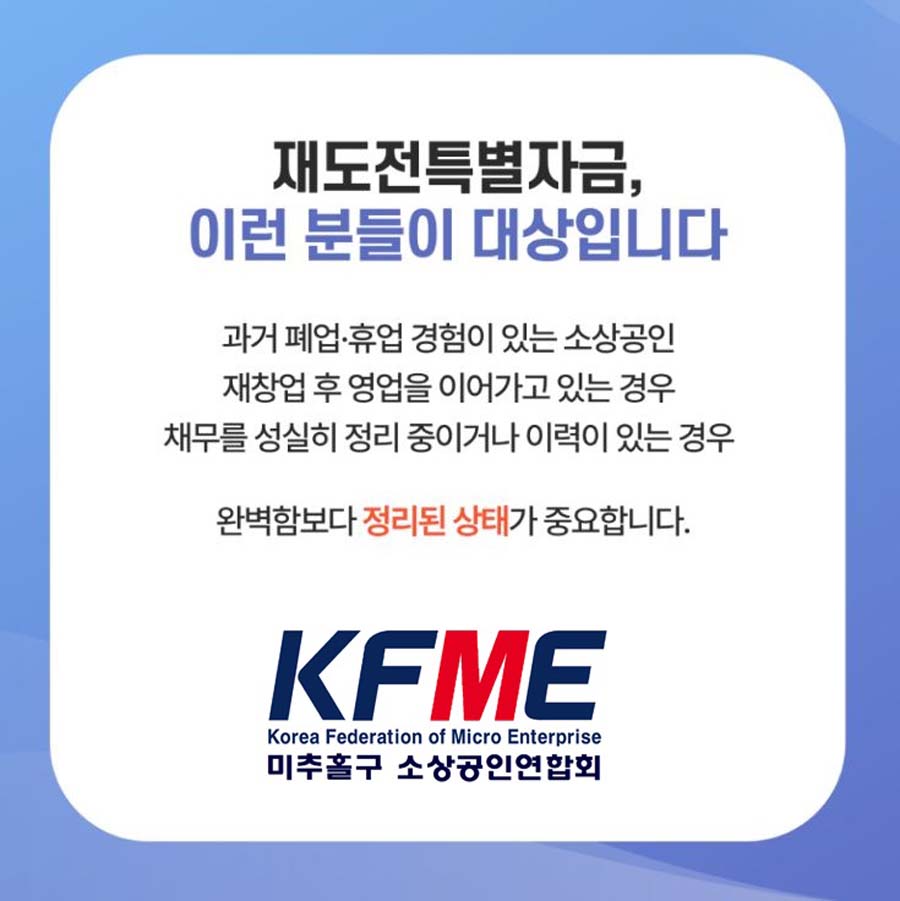 재도전특별자금은 폐업 경험이 있는 소상공인이 7년 이내 재창업을 준비하거나, 이미 재창업 또는 업종전환을 진행 중일 때 저금리와 안정적인 상환조건으로 지원하는 재기 전용 정책자금입니다.